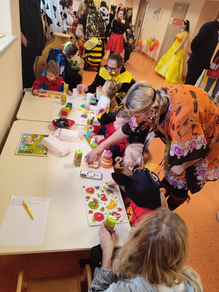 Przybyli rodzice mieli okazję zobaczyć, jak ich maluchy bawią się w atmosferze pełnej zabawy. Wydarzenie rozpoczęło się od sesji zdjęciowej, podczas której dzieci w pięknych, kreatywnych strojach z entuzjazmem prezentowały się przed obiektywem. Po sesji nastał czas na taneczną zabawę. W rytm wesołej muzyki dzieci tańczyły, a rodzice dołączali do świętowania, tworząc wspólną atmosferę radości i integracji. Na koniec, w strefie poczęstunkowej, czekały zdrowe przekąski, które umiliły czas spędzony razem.