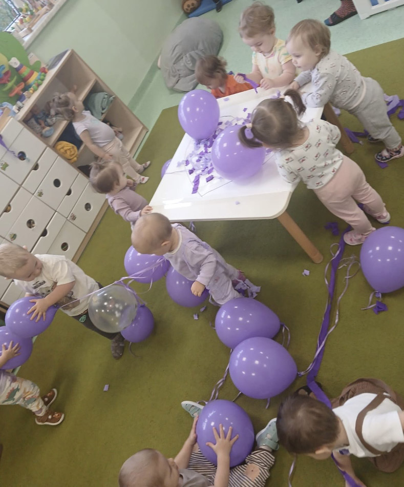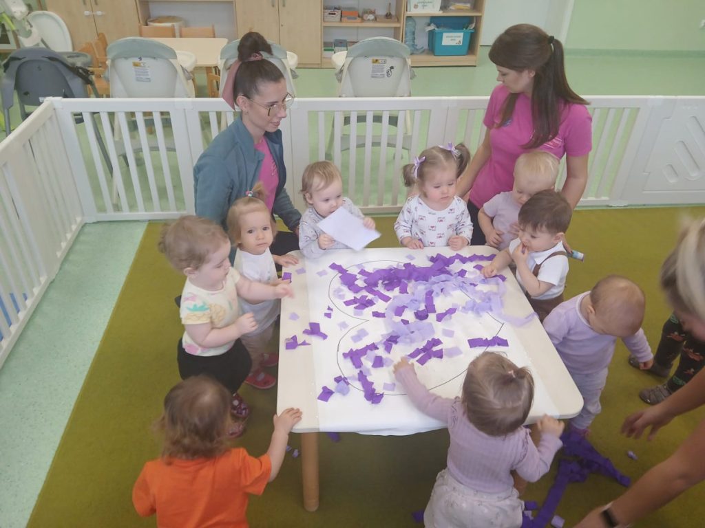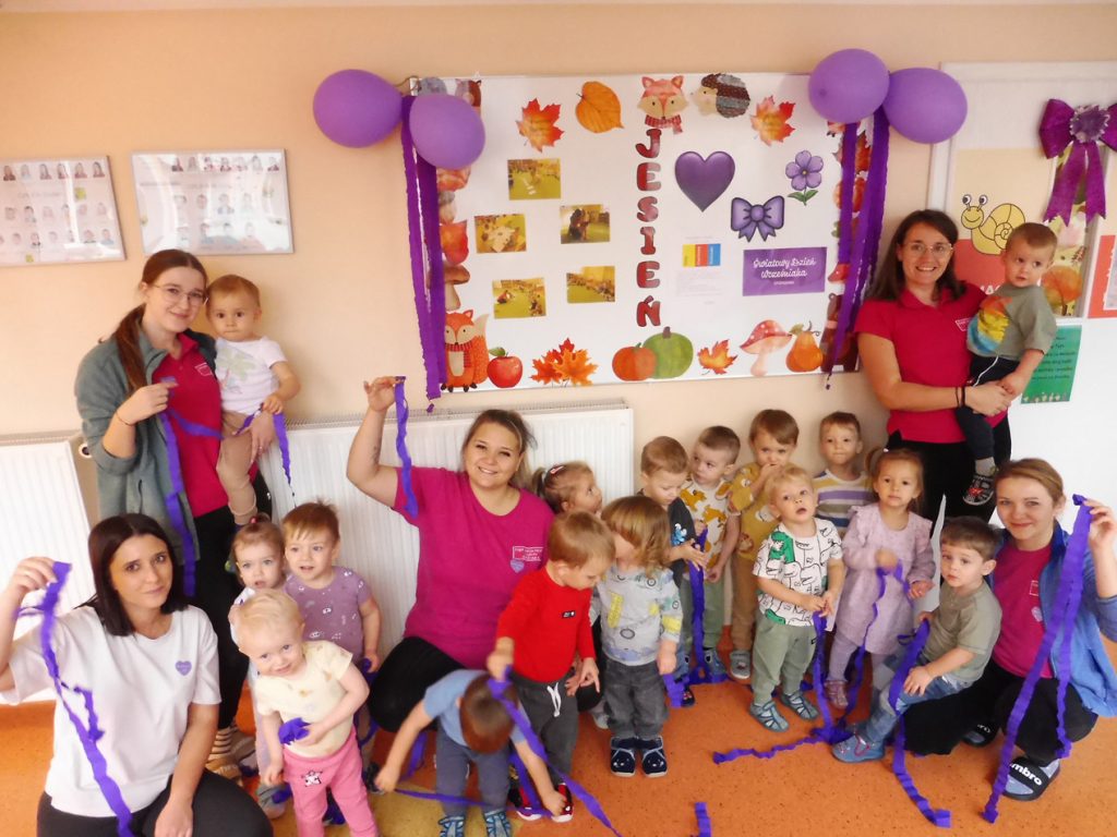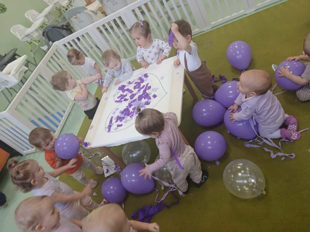 Nasze maluszki wykonały wyjątkowe prace plastyczne – fioletowe serduszka. W tym dniu dominował, również ubiór w kolorze fioletowym, który jest symbolem wsparcia i solidarności z wcześniakami i ich rodzinami.
