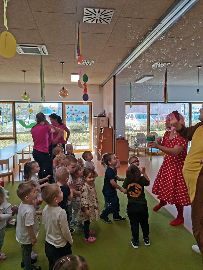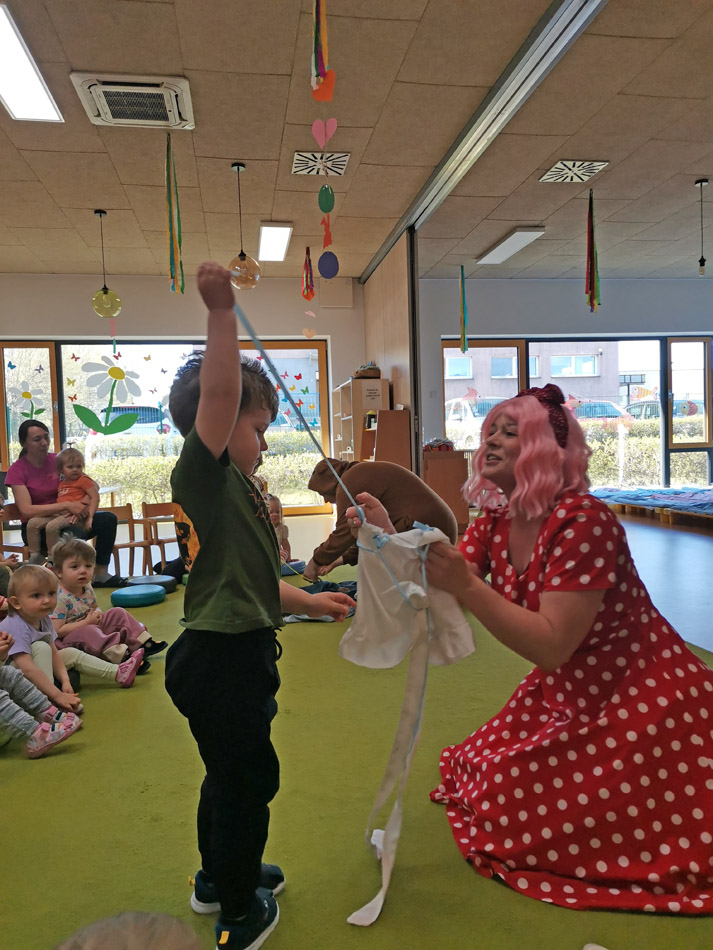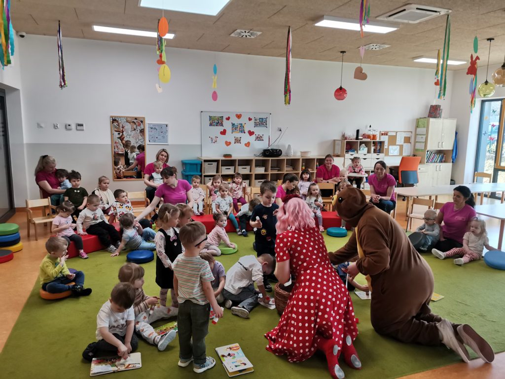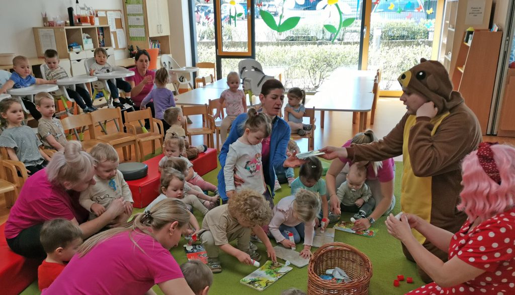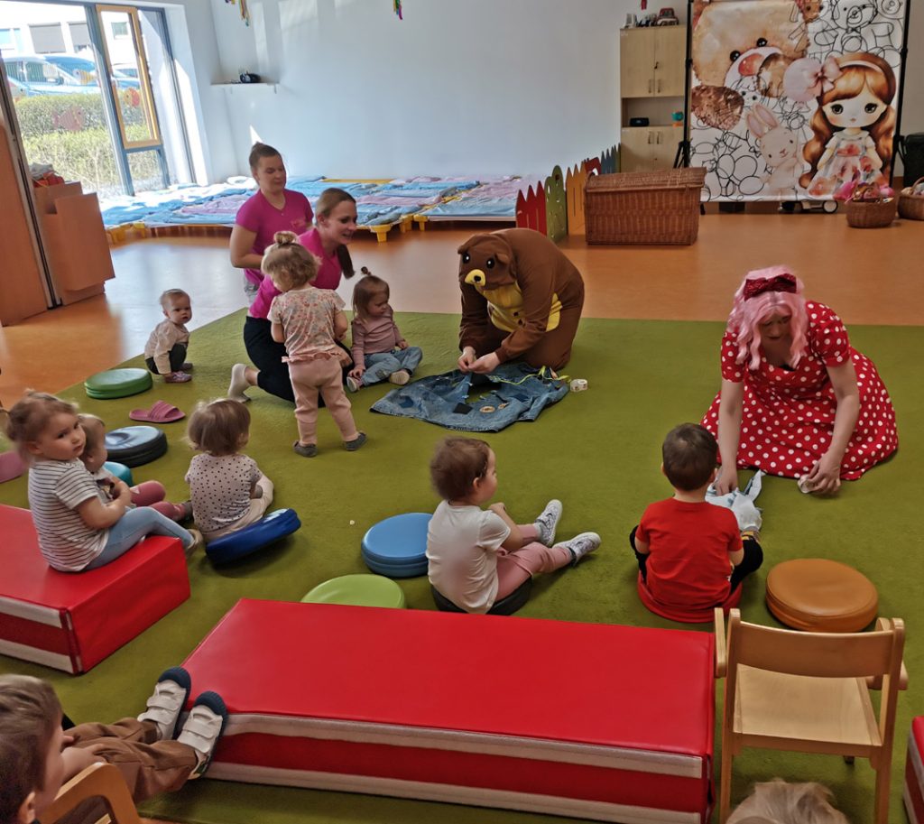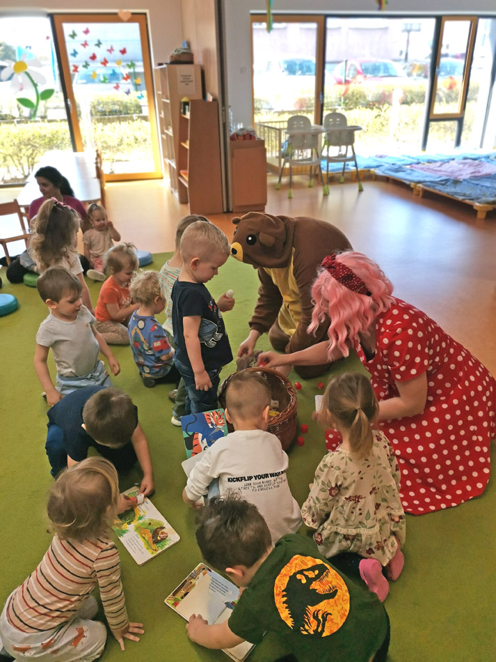 Na początku kwietnia w naszym żłobku zagościł teatrzyk Pompon. Dzieci oglądały przedstawienie pt. „Miś Zdziś i Lalka Amelka, czyli dwie stęsknione za dziećmi zabawki”. Akcja spektaklu toczyła się w żłobkowej sali, w której w trakcie weekendu zabawki odkryły, że samotność nie jest fajna.